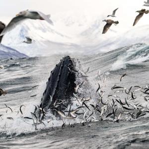 Orcas accompany an industrial fishing vessel, hoping to get an easy meal from the fish escaping the nets. Their presence is marked by curious, playful ‘spy-hops’, as if they are watching the people and the events on the surface.