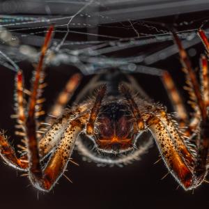 This shot shows a harvestman as it moults, clinging to a beam. It has securely anchored itself with its old skin, allowing it to prepare for its renewal with fine precision. The scene was illuminated with an LED lamp and an external flash, which makes the delicate details visible.